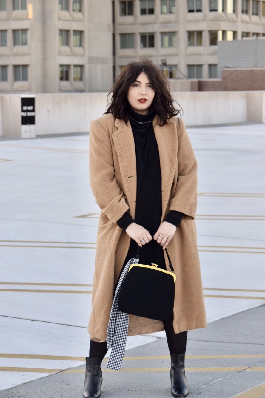 Dress: Lulus | Tights: Target | Coat: Saks Fifth Avenue | Boots: ZARA | Bag: Buffalo Exchange | Jewelry: Thrifted/Boutiques | Lipstick: Smashbox (color: out loud)