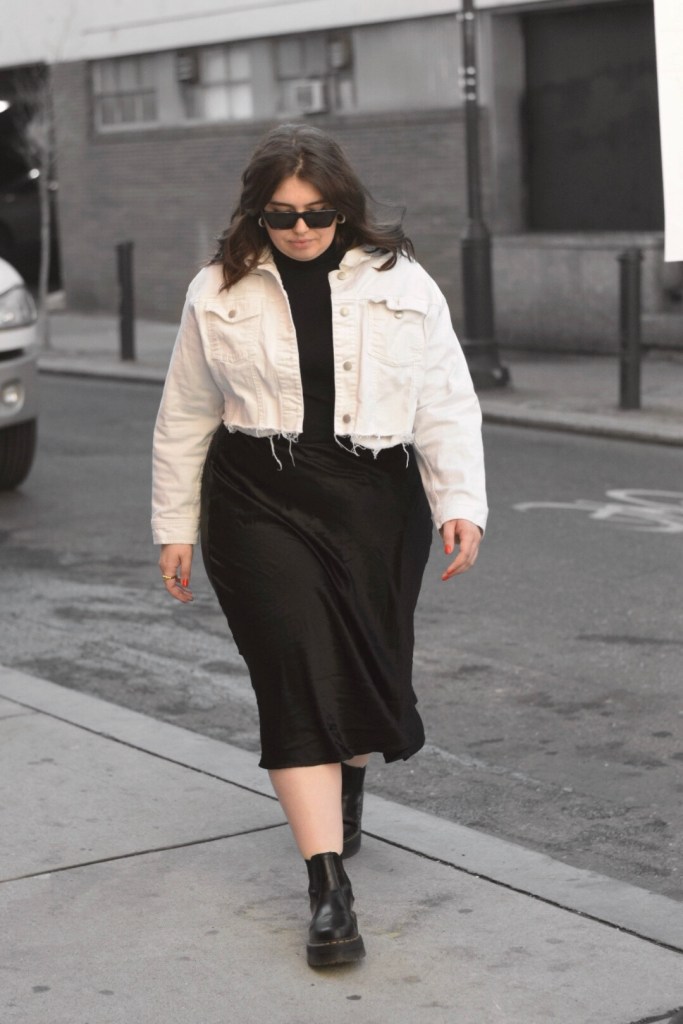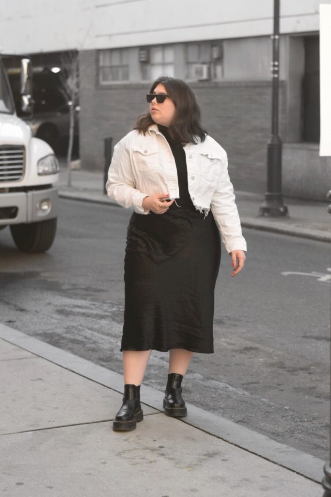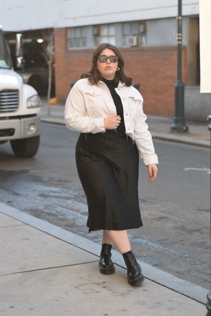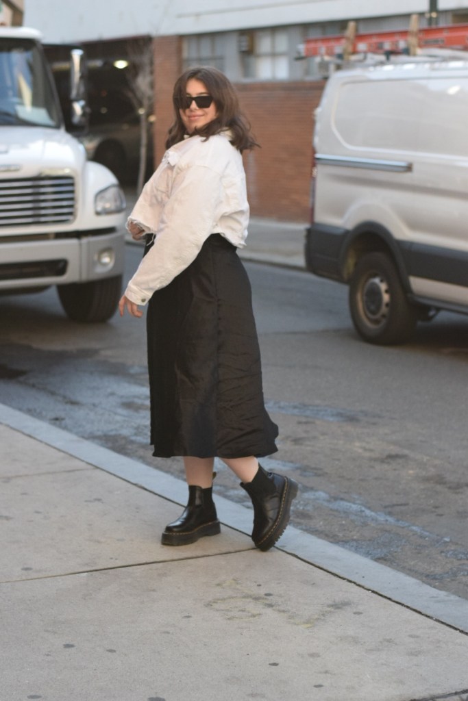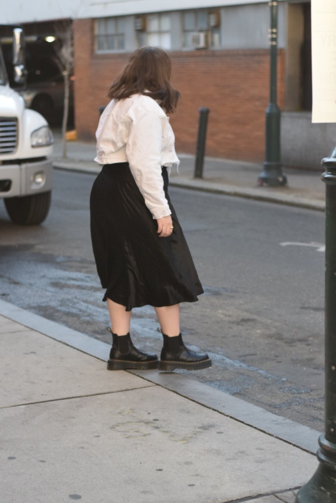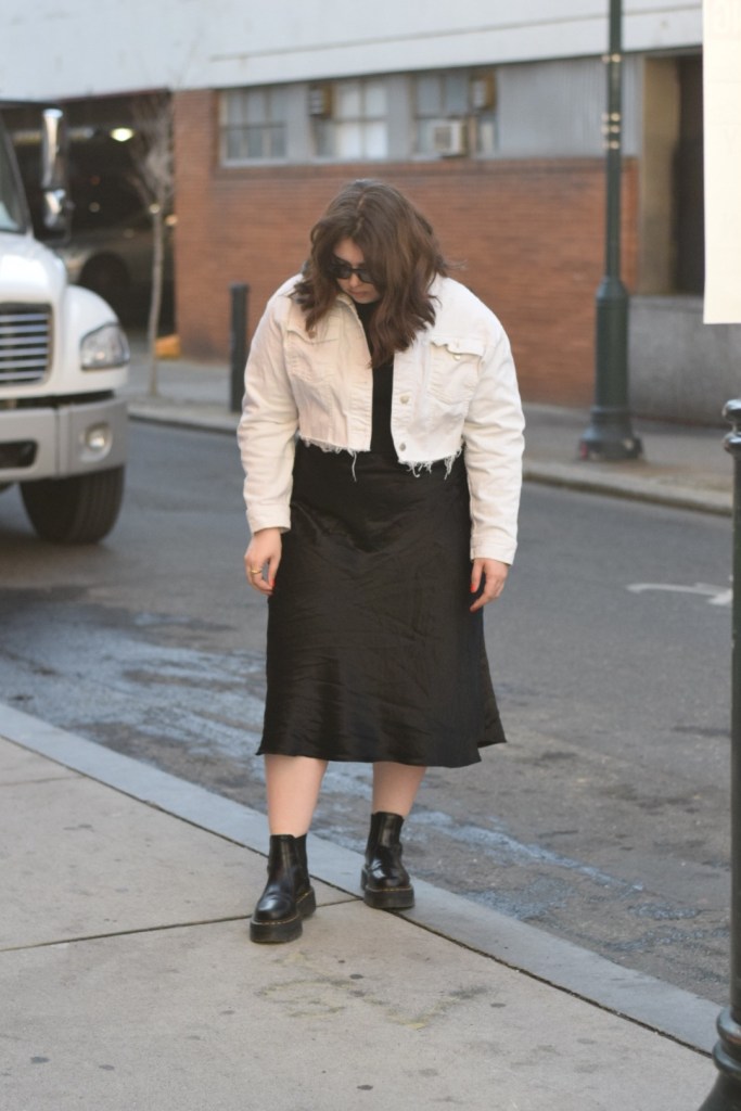 Now back to today’s look, a simple transitional outfit that makes me feel edgy and chic. I started with a simple base: a black light turtleneck and satin midi skirt. I wanted a little contrast so I paired this raw hem, cropped denim jacket. To add a little more edge, I added my go-to platform docs (these bad boys are incredible and have become a staple piece for me!). A good pair of sunnies is all it takes to finish off this look.